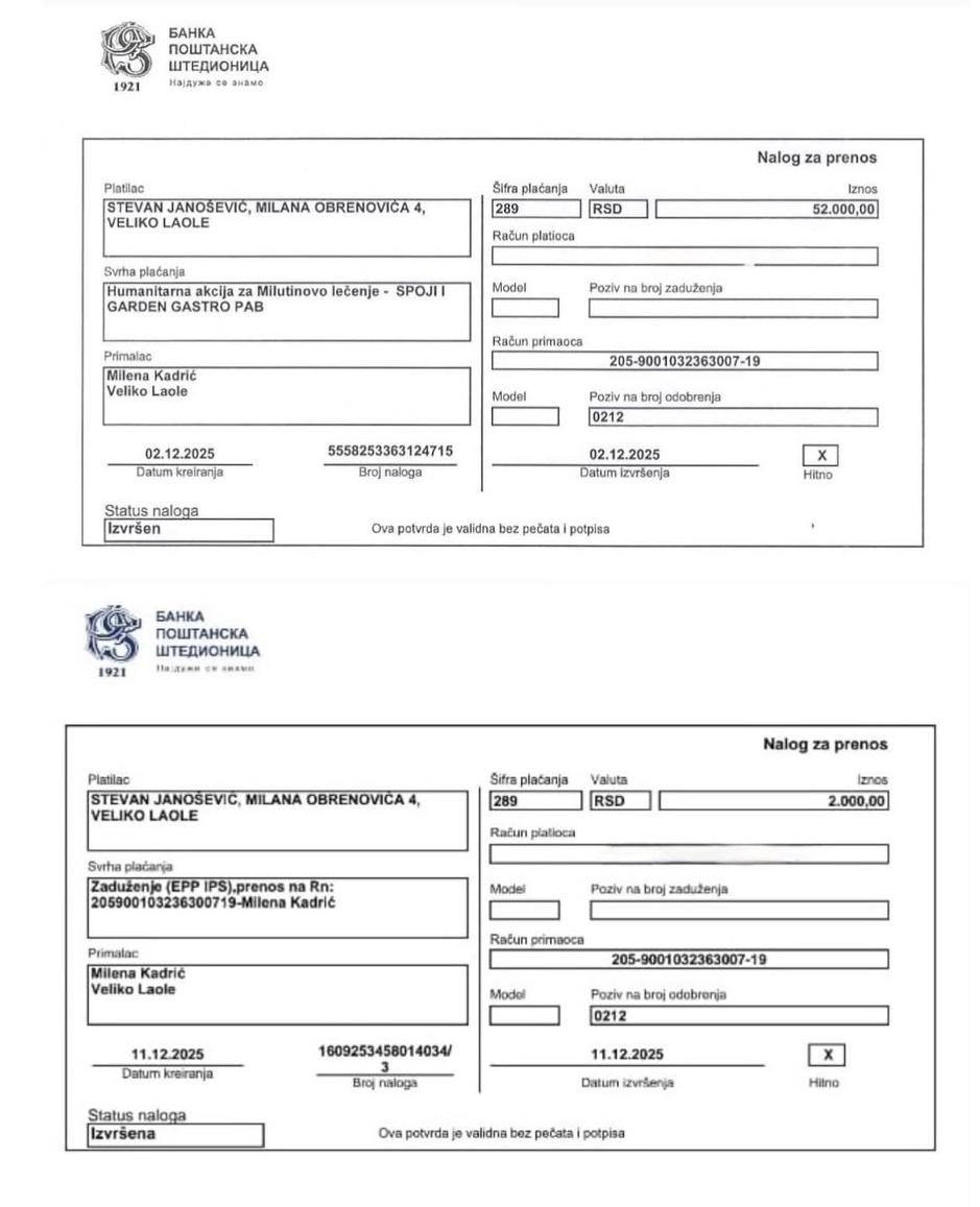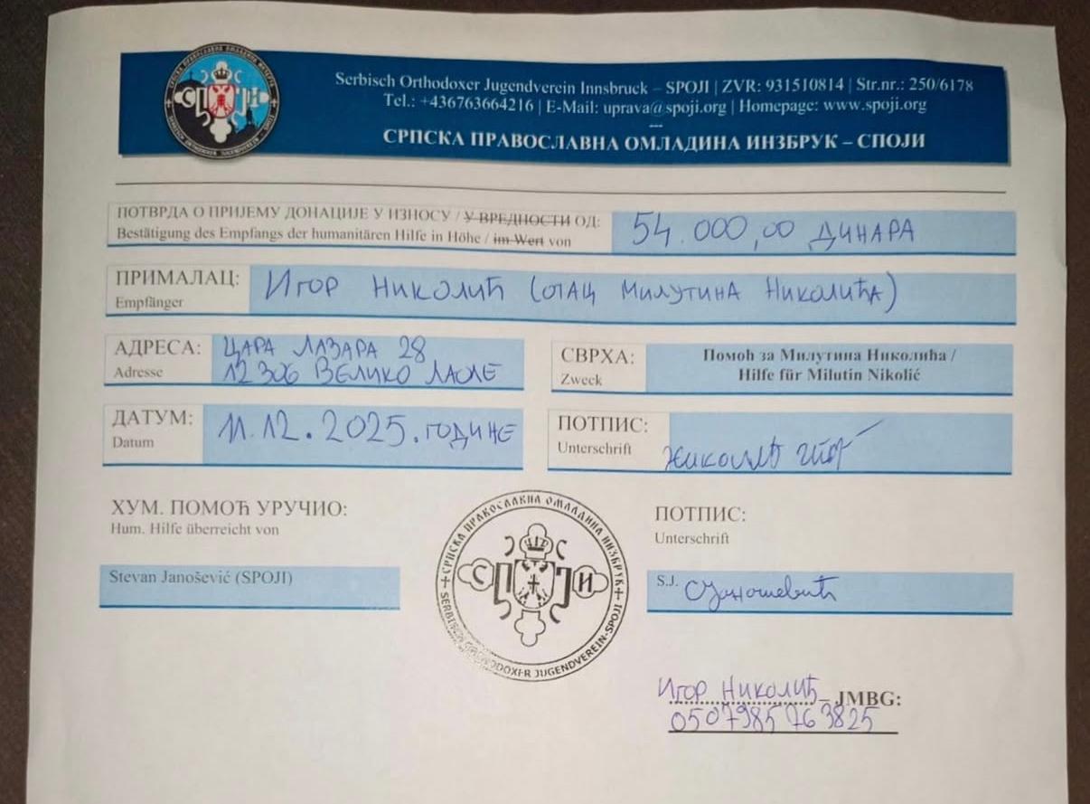 Приход од котизације је у целости ишао за Милутиново лечење (14.000 динара), а власници Гардена су одлучили да новац прикупљен од продаје пића донирају такође (15.000рсд) на чему им се из свег срца захваљујемо. Сав тај новац са прикупљеним новцем из кутија за донације у износу од 54.000 динара (око 462 евра) за лечење нашег Милутина је у децембру уплаћен на рачун његове мајке Милене, док смо са његовим оцем Игором обавили званичну примопредају донације и надамо се да ће уз Божију помоћ овај наш скроман допринос бити корак ка његовом излечењу.
